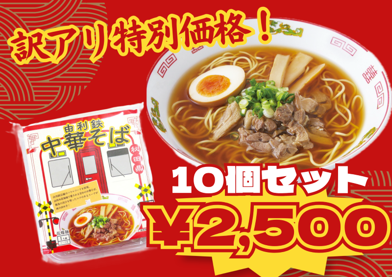 注文番号:A0096 由利鉄中華そば10個セット 個数 数量 1 2 3 4 5 6 7 8 9 10 11 12 13 14 15 16 17 18 ¥2,500(税込) 更に値下げました!! 【訳アリ特別価格】由利鉄中華そば10個セット ※賞味期限が近いため、今だけ特別価格!(賞味期限:2026年5月18日) おいしさはそのまま、お得にお楽しみいただけます◎ ― 由利鉄沿線のソウルフードを再現 ― 由利本荘地域で長く愛されてきた、甘めの懐かしい味わいの中華そば。 親鳥の出汁を使用した、コク深いスープが決め手です。 さらに、トッピングに親鳥の煮込みを加えれば、より一層本格的なおいしさに。 ご自宅で手軽に、由利鉄沿線の味をお楽しみください。 由利鉄中華そば 1食 120g(めん70gスープ50g) 関連商品 RELATED ゆりほん娘*萌酒全8種セット トレーディングカード付き ¥21,600 (税込) 売り切れ 萌酒*松皮カンナ(純米大吟醸)・由利鉄中華そばセット ¥4,500 (税込) ユリテツカレースペシャル ¥700 (税込) 茅舎の四角いセット ¥4,000 (税込) NEW!